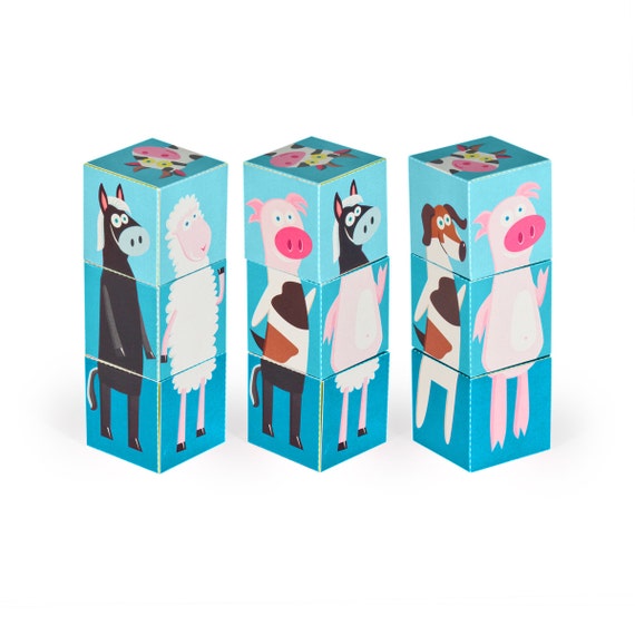 Farm Animals Blocks Blue Printable Pdf Toy Diy Craft Kit Paper Toy 3 Paper Blocks Heads Arms And Legs Birthday Party Favor Etsy